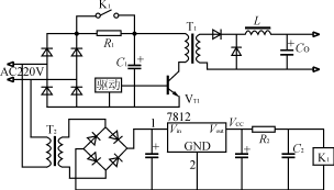 該電路如圖3所示。在電源瞬時(shí)接通時(shí),輸入電壓經(jīng)整流橋VD1VD4和限流電阻R對(duì)電容器C充電。當(dāng)電容器C充電到約80%的額定電壓時(shí),逆變器正常工作,經(jīng)主變壓器輔助繞組產(chǎn)生晶閘管的觸發(fā)信號(hào),使晶閘管導(dǎo)通并短路限流電阻R,開關(guān)電源處于正常運(yùn)行狀態(tài)。