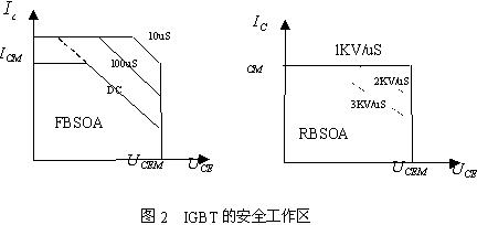在IGBT開關(guān)過程中,大電流和大電壓的重疊造成主要的功耗,同時(shí)承受較高的di/dt和dv/dt即電流電壓應(yīng)力。特別是運(yùn)行在PWM硬開關(guān)狀態(tài)下,這是影響可靠性的重要原因。為了保證其安全可靠的工作,不僅有電流電壓的限制,還必需使其動(dòng)態(tài)過程的運(yùn)行軌跡在安全工作區(qū)內(nèi)。如圖2所示,正偏安全工作區(qū)FBSOA是指柵極加正向電壓時(shí)的安全工作區(qū),對(duì)應(yīng)于導(dǎo)通狀態(tài)。三條邊界分別對(duì)應(yīng)允許電流、允許電壓和允許功耗。隨著導(dǎo)通時(shí)間增長(zhǎng),功耗和溫升增加,安全工作區(qū)縮小。