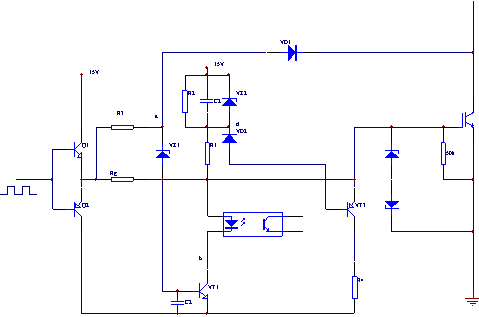 正常工作時(shí),因故障檢測(cè)二極管VD1的導(dǎo)通,將a點(diǎn)的電壓鉗位在穩(wěn)壓二極管VZ1的擊穿電壓以下,晶體管VT1始終保持截止?fàn)顟B(tài)。當(dāng)電路發(fā)生過流或短路故障時(shí),V1上的uce上升,a電壓隨之上升,到一定值時(shí),VZ1擊穿,VT1通,b點(diǎn)電壓下降,電容C1通過電阻R1充電,電容電壓從零開始上升,當(dāng)電容電壓上升約1.4V時(shí),晶體管VT2開通,柵極電壓uge隨電容電壓的上升而下降,通過調(diào)節(jié)C1的數(shù)值,可控制電容的充電速度,進(jìn)而控制uge的下降速度;當(dāng)電容電壓上升到穩(wěn)壓二極管VZ2的擊穿電壓時(shí),VZ2擊穿,uge被鉗位在一固定的數(shù)值上,慢降柵壓過程結(jié)束,同時(shí)驅(qū)動(dòng)電路通過光耦輸出過流信號(hào)傳送至單片機(jī),此時(shí)單片機(jī)發(fā)出聲光報(bào)警并開始運(yùn)行延時(shí)程序。如果在單片機(jī)的延時(shí)過程中,故障信號(hào)消失了,則a點(diǎn)電壓降低, VT1恢復(fù)載止,C1通過R2放電,d點(diǎn)電壓升高,VT2也恢復(fù)截止,uge上升,電路恢復(fù)正常工作狀態(tài),單片機(jī)自動(dòng)進(jìn)行復(fù)位。如果單片機(jī)在延時(shí)結(jié)束后,故障信號(hào)仍存在則由單片機(jī)切斷所有IGBT的輸入脈沖,設(shè)備停止工作,此時(shí)要通過手動(dòng)復(fù)位才能恢復(fù)正常工作。這種電路既能保護(hù)逆變電路和IGBT的安全,又不會(huì)在瞬時(shí)過流時(shí)中斷逆變電源工作所以是一種非常有效的保護(hù)方式。