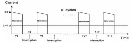 以磨制豆?jié){時(shí)的電流確定最大工作電流,根據(jù)該最大工作電流和最大環(huán)境溫度初步確定TE connectivity LVR系列PPTC的相關(guān)型號(hào)。圖5為多功能豆?jié){機(jī)磨制豆?jié){時(shí)的工作電流,測(cè)得多功能豆?jié){機(jī)的直流馬達(dá)的最大電流為800mA,由于磨制豆?jié){時(shí)馬達(dá)是間隔一定時(shí)間工作的,并不是一直連續(xù)工作的,間隔時(shí)間由豆?jié){機(jī)MCU計(jì)時(shí)電路控制,所以計(jì)算PPTC要能維持的最大工作電流指的是馬達(dá)工作整個(gè)周期的平均電流,圖中所示的800mA的最大電流換算成在一個(gè)完整工作周期內(nèi)為450mA。查閱LVR100在85度下的hold電流大約是550mA,所以首先選取LVR100。