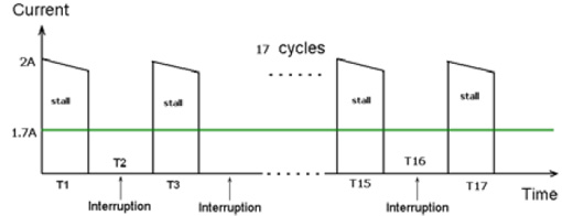 圖6為多功能豆?jié){機(jī)的堵轉(zhuǎn)電流。在榨水果的堵轉(zhuǎn)情況下,實(shí)測(cè)馬達(dá)的堵轉(zhuǎn)最大電流為2A,由于榨果汁時(shí)馬達(dá)也不是一直連續(xù)工作的,也是間隔一定時(shí)間工作,間隔時(shí)間是馬達(dá)工作6S,停3S,這樣換算成在一個(gè)榨水果完整工作周期內(nèi)平均電流是1.6~1.7A。在1.6~1.7A堵轉(zhuǎn)電流下,馬達(dá)堵轉(zhuǎn)需要保護(hù)的時(shí)間要求在150S內(nèi)。