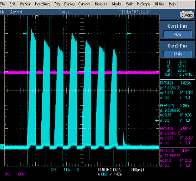 可見LVR100的典型值組件在0C/25C溫度下馬達(dá)保護(hù)時(shí)間還會(huì)更快,完全滿足小于150S的馬達(dá)保護(hù)要求。圖7為在25度下馬達(dá)堵轉(zhuǎn)保護(hù)的實(shí)測(cè)波形。