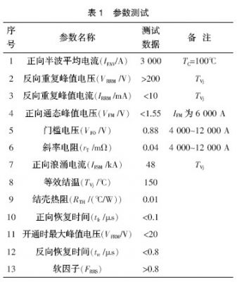 測試研制生產(chǎn)的器件,以規(guī)格是直徑48 mm/3 000 A/200 V的器件為例,記錄實(shí)測結(jié)果如表1所列。