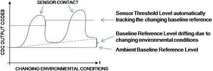 保持可靠性能。容性傳感器電極是采用PCB上的標(biāo)準(zhǔn)銅材料或柔性材料制成的。這種材料的特性會(huì)隨溫度和濕度的變化而發(fā)生改變。這種變化會(huì)使基線電平發(fā)生偏移(所有傳感器閾值電平均是以基線電平為參考的)。較大的基線偏移增加了接觸閾值電平過低或過高的風(fēng)險(xiǎn)(過低還是過高取決于基線偏移的方向)這會(huì)引起虛假的接觸誤差,或使閾值電平不是太靈敏就是不夠靈敏,導(dǎo)致接觸狀態(tài)的不穩(wěn)定。為保持傳感器原始的信號(hào)接觸閾值檢測電平余量(靈敏度),CDC需要自動(dòng)跟蹤基線偏移誤差的幅度,并對(duì)閾值設(shè)置進(jìn)行相應(yīng)的重新調(diào)整。圖2中的示例介紹了AD7147和AD7148的閾值電平如何針對(duì)因環(huán)境條件變化引起的基線失調(diào)變化進(jìn)行自動(dòng)跟蹤和調(diào)整。