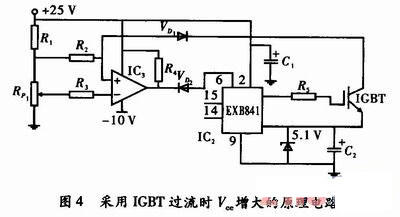 當(dāng)電源輸出過(guò)載或者短路時(shí),IGBT的Vce值則變大,根據(jù)此原理可以對(duì)電路采取保護(hù)措施。對(duì)此通常使用專用的驅(qū)動(dòng)器EXB841,其內(nèi)部電路能夠很好地完成降柵以及軟關(guān)斷,并具有內(nèi)部延遲功能,可以消除干擾產(chǎn)生的誤動(dòng)作。其工作原理如圖4所示,含有IGBT過(guò)流信息的Vce不直接發(fā)送到EXB841的集電極電壓監(jiān)視腳6,而是經(jīng)快速恢復(fù)二極管VD1,通過(guò)比較器IC1輸出接到EXB841的腳6,從而消除正向壓降隨電流不同而異的情況,采用閾值比較器,提高電流檢測(cè)的準(zhǔn)確性。假如發(fā)生了過(guò)流,驅(qū)動(dòng)器:EXB841的低速切斷電路會(huì)緩慢關(guān)斷IGBT,從而避免集電極電流尖峰脈沖損壞IGBT器件。