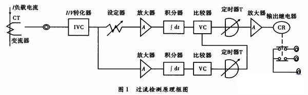 過(guò)流檢測(cè)傳感器的工作原理如圖1所示。通過(guò)變流器所獲得的變流器次級(jí)電流經(jīng)I/V轉(zhuǎn)換成電壓,該電壓直流化后,由電壓比較器與設(shè)定值相比較,若直流電壓大于設(shè)定值,則發(fā)出辨別信號(hào)。但是這種檢測(cè)傳感器一般多用于監(jiān)視感應(yīng)電源的負(fù)載電流,為此需采取如下措施。由于感應(yīng)電源啟動(dòng)時(shí),啟動(dòng)電流為額定值的數(shù)倍,與啟動(dòng)結(jié)束時(shí)的電流相比大得多,所以在單純監(jiān)視電流電瓶的情況下,感應(yīng)電源啟動(dòng)時(shí)應(yīng)得到必要的輸出信號(hào),必須用定時(shí)器設(shè)定禁止時(shí)間,使感應(yīng)電源啟動(dòng)結(jié)束前不輸出不必要的信號(hào),定時(shí)結(jié)束后,轉(zhuǎn)入預(yù)定的監(jiān)視狀態(tài)。