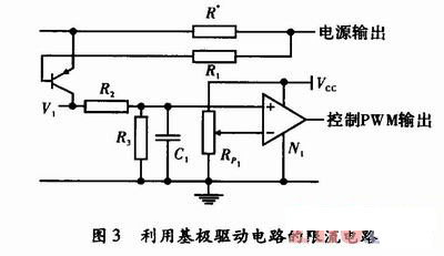 在一般情況下,利用基極驅(qū)動(dòng)電路將電源的控制電路和開(kāi)關(guān)晶體管隔離開(kāi)??刂齐娐放c輸出電路共地,限流電路可以直接與輸出電路連接,工作原理如圖3所示,當(dāng)輸出過(guò)載或者短路時(shí),V1導(dǎo)通,R3兩端電壓增大,并與比較器反相端的基準(zhǔn)電壓比較??刂芇WM信號(hào)通斷。