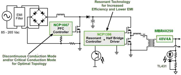 在這類要求超高能效的更大功率LED區(qū)域照明應(yīng)用中,可以結(jié)合采用安森美半導(dǎo)體的NCP1607 PFC控制器和NCP1397雙電感加單電容(LLC)半橋諧振控制器,用于功率在50到300 W范圍的高能效LED街道照明應(yīng)用。NCP1397是最新高性能諧振模式LLC控制器,集成了600 V高壓浮動(dòng)驅(qū)動(dòng)器,支持50到500 kHz的高頻工作,內(nèi)置高端和低端驅(qū)動(dòng)器,支持可調(diào)節(jié)及精確的最低頻率,提供極高能效,并具備多種故障保護(hù)特性。