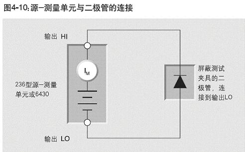 圖4-10 示出如何使用236型或6430型SMU來測量二極管的泄漏電流。236型SMU能夠以10fA的分辨率測量電流,并且輸出需要的偏置電壓。6430型SMU的分辨率為10aA。源-測量單元還可以測量其它的二極管參數(shù),包括正向電壓降和擊穿電壓。