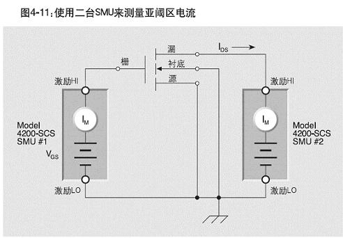 亞閾區(qū)電流測試常常在晶圓片級進(jìn)行。它是表示器件打開和關(guān)閉的快慢程度的參數(shù)。圖4-11示出測量亞閾區(qū)電流的典型測試設(shè)置情況。在此配置中,4200型半導(dǎo)體特性分析系統(tǒng)配備了2個SMU和前置放大器。使用一個SMU來提供恒定的漏-源電壓(VDS),并測量產(chǎn)生的漏極電流(IDS)。另一個SMU用來掃描柵-源電壓(VGS)。對這個SMU來說,應(yīng)當(dāng)將鉗位電流或測量電流值設(shè)置為固定測量量程上的最高期望的柵極電流。