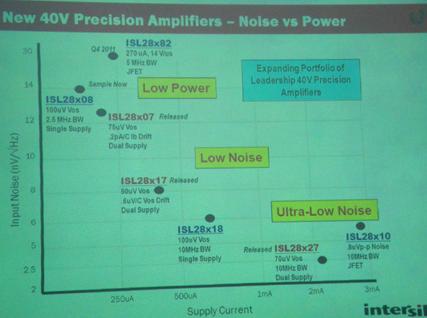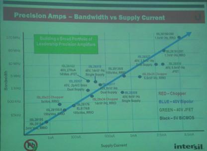Intersil建立一個以精準(zhǔn)放大器為主的大系列產(chǎn)品,從最初的ISL28194到ISL28190/290產(chǎn)品,頻帶寬度和電流都有很大提升。