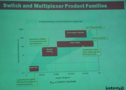 Roger還介紹了Intersil開關(guān)和多路復(fù)用器及接口產(chǎn)品線的情況,其sub 0.5Ω開關(guān)用于便攜應(yīng)用,中壓產(chǎn)品用于通信和視頻應(yīng)用,并且能提供高壓單/雙電源開關(guān)等。