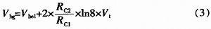 其中I是三極管射極電流,Is與射極面積成正比,n為一常數(shù),取1。這里,取VQC2:VQC1=8:1,因此Is2=8xIs1,又I1=I2,分別代入(1)并相除,整理得: