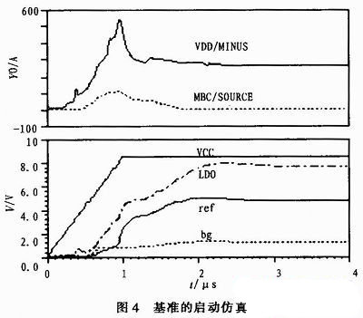 MBC控制作用的簡述:在1μs時(shí)流過100μA的啟動(dòng)電流,當(dāng)LDO、ref、bg建立最低工作電壓后,啟動(dòng)電路開始關(guān)斷過程,電流急劇減小,并最終在2μs時(shí)接近0A。整個(gè)電路正常運(yùn)行時(shí)消耗的電流是266μA。