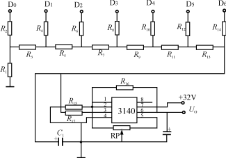 這需要將計數(shù)器的二進制數(shù)轉(zhuǎn)化為電壓。顯然用D/A轉(zhuǎn)換是可以的,但電路復雜程度上升,成本也有所提高。故為了簡化電路我們僅借用D/A轉(zhuǎn)換網(wǎng)絡(luò)的思想,利用權(quán)電阻T形網(wǎng)絡(luò)將4516的7位數(shù)值變換成模擬量輸出,推動電壓表指示,見圖5。