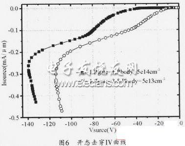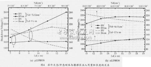 針對(duì)nLDMOS器件開態(tài)耐壓低的問(wèn)題,有針對(duì)性地仿真了溝道長(zhǎng)度、多晶硅柵場(chǎng)板長(zhǎng)度及體區(qū)濃度對(duì)開態(tài)耐壓的影響。圖5(a)為nLDMOS的關(guān)態(tài)耐壓、開態(tài)耐壓及閾值與溝道長(zhǎng)度(Lch)的關(guān)系??梢钥闯鰷系篱L(zhǎng)度對(duì)器件的開態(tài)耐壓和關(guān)態(tài)耐壓影響很小。閾值隨著溝道長(zhǎng)度的增加而增加,這是由于采用橫向雙擴(kuò)散形成溝道,所以隨著溝道長(zhǎng)度增加,p型體區(qū)的濃度越來(lái)越大,閾值也就越來(lái)越大。圖5(b)為nLDMOS的關(guān)態(tài)耐壓、開態(tài)耐壓及閾值與多晶硅柵極場(chǎng)板長(zhǎng)度(LPgate)的關(guān)系。在柵極場(chǎng)板較長(zhǎng)時(shí),其對(duì)閾值和關(guān)態(tài)耐壓影響很小,當(dāng)柵極場(chǎng)板縮短到多晶硅柵不能覆蓋溝道時(shí),器件的開態(tài)耐壓大幅增加。這時(shí)閾值也迅速增加。雖然多晶硅柵不能完全覆蓋溝道,但是由于開態(tài)時(shí)nLDMOS的柵漏電壓差很大,所以仍然能夠在表面形成反型層溝道。因此,大幅減短?hào)艠O場(chǎng)板能有效提高器件的開態(tài)耐壓,但是同時(shí)也帶來(lái)了器件不能有效開啟的問(wèn)題。圖5(c)為nLDMOS的關(guān)態(tài)耐壓、開態(tài)耐壓及閾值與體區(qū)注入劑量(Pbody)的關(guān)系??梢钥闯鲈黾芋w區(qū)的注入劑量對(duì)器件的耐壓影響很小。但是隨著注入劑量的增加,體區(qū)濃度增加,所以閾值就增加,同時(shí)器件的開態(tài)耐壓也隨之增加。當(dāng)體區(qū)注入劑量達(dá)到5e14cm-2時(shí),閾值增加緩慢,開態(tài)耐壓卻大幅增加,所以只能通過(guò)閾值上的犧牲來(lái)改善nLDMOS的開態(tài)擊穿耐壓。