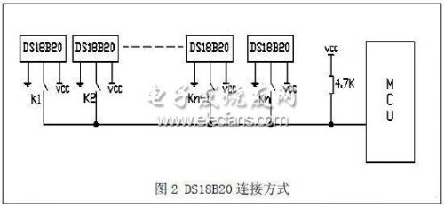 度采樣。需要說明的是,采用DS18B20 多點組網(wǎng)功能也可以實現(xiàn)單體電池溫度采樣,但是多點采樣時需要識別每個DS18B20 獨有的ROM 碼,影響采樣速度,同時無法將ROM碼同器件的實際物理位置關(guān)聯(lián)起來,所以多點組網(wǎng)功能不適合單體電池溫度的巡檢?;谟蒁 觸發(fā)器構(gòu)成的移位寄存陣所具有的通道選通功能,本文提出一種同時啟動,分時讀取數(shù)據(jù)的DS18B20 多點溫度采樣方法。該種方法中DS18B20的采樣啟動和數(shù)據(jù)讀取都是跳過ROM 碼校驗進行的。DS18B20 的連接方式如圖2 所示。