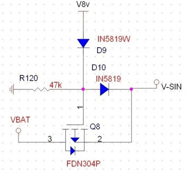 第一種應用,由PMOS來進行電壓的選擇,當V8V存在時,此時電壓全部由V8V提供,將PMOS關閉,VBAT不提供電壓給VSIN,而當V8V為低時,VSIN由8V供電。注意R120的接地,該電阻能將柵極電壓穩(wěn)定地拉低,確保PMOS的正常開啟,這也是前文所描述的柵極高阻抗所帶來的狀態(tài)隱患。D9和D10的作用在于防止電壓的倒灌。D9可以省略。這里要注意到實際上該電路的DS接反,這樣由附生二極管導通導致了開關管的功能不能達到,實際應用要注意。