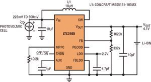 串聯(lián)連接的高壓光伏電池組能提供充足的功率,但單節(jié)光伏電池解決方案卻很少見,因為單節(jié)光伏電池在有負載情況下產(chǎn)生的電壓很低,從這么低的電壓難以產(chǎn)生有用的電源軌。幾乎沒有升壓型轉(zhuǎn)換器能從電壓很低、阻抗相對較高的單節(jié)光伏電池產(chǎn)生輸出。不過,LTC3105是專門為應(yīng)對這類挑戰(zhàn)而設(shè)計。該器件具有超低的250mV啟動電壓和可編程最大功率點控制,能從富有挑戰(zhàn)性的光伏電源產(chǎn)生大多數(shù)應(yīng)用所需的典型電壓軌(1.8~5V)。