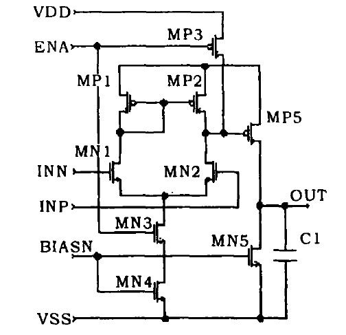 過放電檢測電路(VD2)可利用一個二級開環(huán)比較器來實現(xiàn),如圖2所示。在設(shè)計中應(yīng)采用差分輸入并盡可能地提高增益,以滿足精度要求。該電路中,第一級是由MN1,MN2,MP1,MP2,MN3,MN4組成的差分放大器。第二級是由MP5,MN5組成的單級放大器。前級放大器放大輸入的差模信號,后一級將前級的輸出進一步放大,以達到數(shù)字信號的輸出電平。該比較器電路的直流增益為: