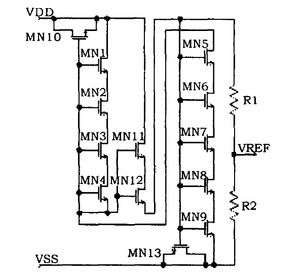 基于耗盡型NMOS管閾值電壓為負值,在VGS=0時也處于工作狀態(tài),該特性可有效降低其工作電壓及功耗。因而,該基準電路中利用串聯(lián)的耗盡型NMOS管MN1-MN4、串聯(lián)的增強型NMOS管MN5-MN9、MN11-MN12和電阻R1、R2構(gòu)成基于VGS的基準電壓電路,該基準電路的輸出為檢測比較器反相端的基準電壓信號VREF。