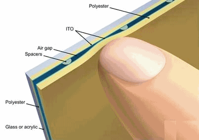 相反地,這種技術(shù)的主要缺點(diǎn)源于觸控屏幕的多層結(jié)構(gòu)。其基層一般是玻璃,表面涂有一層均勻的ITO,頂層通常由聚乙烯對(duì)苯二甲酸酯(PET)制造,內(nèi)表面(Inner Surface)也涂有一層均勻的ITO,而外表面(Outer Surface)則有硬涂層,以為保護(hù)作用,而形成空氣隙以把這些導(dǎo)電層隔離開(kāi)的細(xì)小透明間隔點(diǎn)常在打印制程中產(chǎn)生。這種多層材料堆棧的多層結(jié)構(gòu)對(duì)透光性有所影響,一般將降至約透明玻璃透光率的75%,同時(shí),空氣間隙可能產(chǎn)生薄霧效應(yīng),進(jìn)一步降低清晰度。此外,這種結(jié)構(gòu)很容易刮傷損壞,而且因?yàn)闄C(jī)械軸性不重合,還須仔細(xì)校準(zhǔn)以確定X、Y坐標(biāo)范圍,其它弱點(diǎn)還包括可能吸收電氣噪聲,尤其是來(lái)自液晶顯示器(LCD),這時(shí)一般須進(jìn)行濾波,將導(dǎo)致反應(yīng)時(shí)間的延長(zhǎng),當(dāng)然,控制器一次只能處理一個(gè)觸摸位置,也是一大局限。