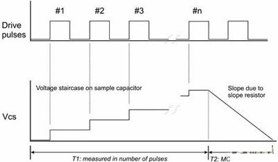 脈沖串產(chǎn)生的第一個(gè)斜坡是加到采樣電容上的梯級(jí)波形訊號(hào),脈沖串過(guò)后,驅(qū)動(dòng)器把斜率電阻的參考端切換為高電平,對(duì)采樣電容進(jìn)行放電,直到將電荷用完,電壓比較器檢測(cè)出零交叉點(diǎn)為止,獲得零交叉點(diǎn)所需的斜坡時(shí)間與X、Y電荷耦合成比例,并隨用戶手指觸摸面板表面而減?。▓D5)。