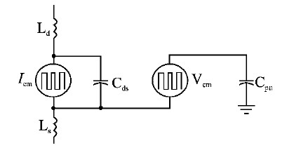 由于需要分別對(duì)DM 噪聲和CM 噪聲進(jìn)行分析,所以對(duì)DM 噪聲源和CM 噪聲源也需要分別建模。M.Nave提出使用電流源作為DM 噪聲源,使用電壓源作為CM 噪聲源的方法,就是因?yàn)镈M 噪聲主要由di/dt引起,而CM 噪聲則主要由dv/dt引起。在此基礎(chǔ)上對(duì)CM 噪聲源進(jìn)行改進(jìn),考慮了電壓過(guò)沖和下沖,并且在線路阻抗近似平衡的情況下,利用DM 電流源和一個(gè)電壓源來(lái)表示CM 噪聲源(如圖2所示)。