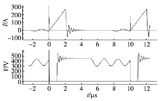 文獻(xiàn)基本都是用梯形波來(lái)表示噪聲源的,但實(shí)際中并不是每個(gè)電路中的開(kāi)關(guān)器件的波形都能很好地用梯形波近似,圖3所示即為一個(gè)反激電源開(kāi)關(guān)管的電流電壓波形,除了梯形波之外,還有電流尖峰,電壓過(guò)沖和下沖等分量,會(huì)導(dǎo)致噪聲源的頻譜與梯形波有一定的不同。所以不能盲目地使用梯形波來(lái)表征噪聲源,而是需要對(duì)電路進(jìn)行分析或者仿真,從而得到開(kāi)關(guān)器件的電流或電壓波形,基于此波形再對(duì)噪聲源進(jìn)行建模,這樣才能更精確地反映開(kāi)關(guān)電源的電磁干擾。