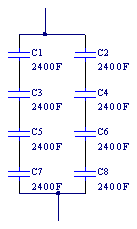 本文采用SU2400P-0027V-1RA超級電容,具有較高的功率比、能量比和較低的等效串聯(lián)電阻(ESR(DC)=1mΩ)。為了構(gòu)成替代12V蓄電池的超級電容模塊,我們采用8個2400F/2.7V的電容構(gòu)成模塊,采用4個超級電容單體串聯(lián),兩組并聯(lián)的方式構(gòu)成,如圖1所示。