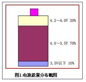目前手機使用的電池都是鋰離子電池,在手機工作時,電池不斷放電,電池電壓不斷下降,電池放電的電流不同,電壓下降的曲線速率也不同,一般來說,在電池電壓3.5V~4.2V之間集中了90%的電池能量。電池能量分布如下圖所示。