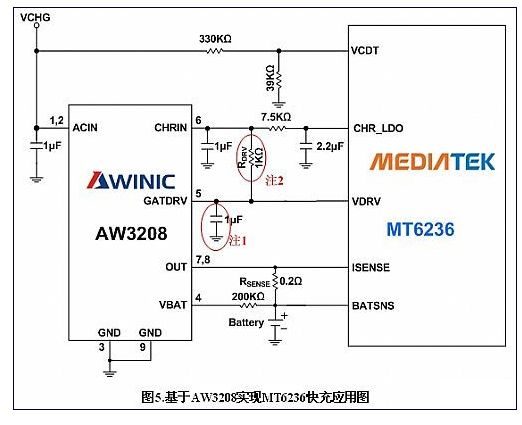 上海艾為電子專門針對MT6235/36平臺推出的AW3208在增加OVP功能的同時,提供了智能充電功能,以滿足快速充電的功能。如圖2所示,AW3208內(nèi)置專有的K-ChargeTM技術(shù),可根據(jù)芯片溫度智能調(diào)整輸出電流,以保證在充電期間整個充電系統(tǒng)的安全。使得手機在實現(xiàn)快速充電的時候不會因為由于環(huán)境溫度較高或者充電電流過大導(dǎo)致芯片進入過溫保護使得充電沒法正常進行。圖3為在MT6235上的典型應(yīng)用圖。