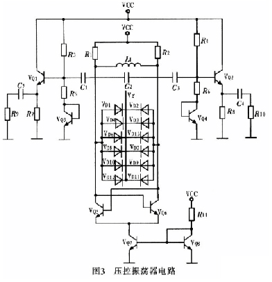壓控振蕩器按構(gòu)成原理可分為反饋型振蕩器和負阻型振蕩器2大類。這里采用負阻型振蕩器,其主要是由負阻器件和諧振回路組成的振蕩器,利用負阻器件的負電阻效應與諧振回路中的損耗正電阻相抵消,維持諧振回路的穩(wěn)定振蕩。圖3為壓控振蕩器電路。