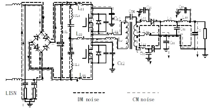 通常電路中的共模干擾和差模干擾是同時(shí)存在的,共模干擾存在于電源的任意一個(gè)相線與大地之間,差模干擾存在于相線與相線之間。法國Grenoble 電技術(shù)實(shí)驗(yàn)室的Teuling、Schnaen 和Roudet 基于由MOSFET 構(gòu)成的400W、開關(guān)頻率為100KHz 的斬波電路實(shí)驗(yàn)?zāi)P偷难芯勘砻鳎皖l時(shí)差模干擾占主導(dǎo)地位;高頻時(shí),共模干擾占主導(dǎo)地位,這說明開關(guān)電源的差模干擾和共模干擾對電路的影響程度是不同的;另一方面,線路寄生參數(shù)對差模干擾和共模干擾的影響也不同,由于線間阻抗與線———地阻抗不同,干擾經(jīng)長距離傳輸后,差模分量的衰減要比共模大。因此,為了解決開關(guān)電源的傳導(dǎo)噪聲問題,需要首先區(qū)分共模和差模干擾,這就需要建立共模和差模噪聲路徑,然后對它們分別進(jìn)行仿真和分析,這種方法便于我們找到電磁干擾問題的根源,便于問題的解決。