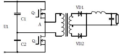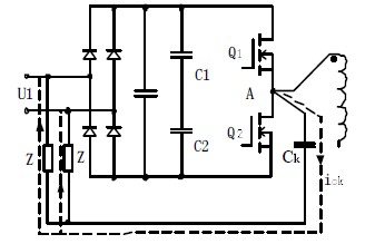 在PWM變換器工作時(shí),伴隨著開關(guān)器件的工作,也相應(yīng)產(chǎn)生了共模噪聲。如圖1 所示,對于半橋變換器,開關(guān)管Q1 的漏級電壓始終為U1,源級電位隨開關(guān)狀態(tài)的改變而在0 和U1/2 之間變化;Q2 的源極電位始終為0,漏極電位在0 和U1/2之間變化。為使開關(guān)管和散熱器能保持良好接觸,往往在開關(guān)管底部與散熱器之間加上絕緣墊片或者抹上導(dǎo)熱性能良好的絕緣硅膠。這使得A 點(diǎn)對地之間相當(dāng)于存在一個(gè)并聯(lián)耦合電容CK。當(dāng)開關(guān)管Q1、Q2 的狀態(tài)發(fā)生改變,使A 點(diǎn)電位發(fā)生變化時(shí),就會(huì)在CK 上產(chǎn)生噪聲電流Ick,如圖2 所示。該電流由散熱器到達(dá)機(jī)殼,而機(jī)殼也即大地與主電源線存在耦合阻抗,形成圖2中虛線所示的共模噪聲通路。于是,共模噪聲電流在地與主電源線的耦合阻抗Z 上產(chǎn)生壓降,形成共模噪聲。