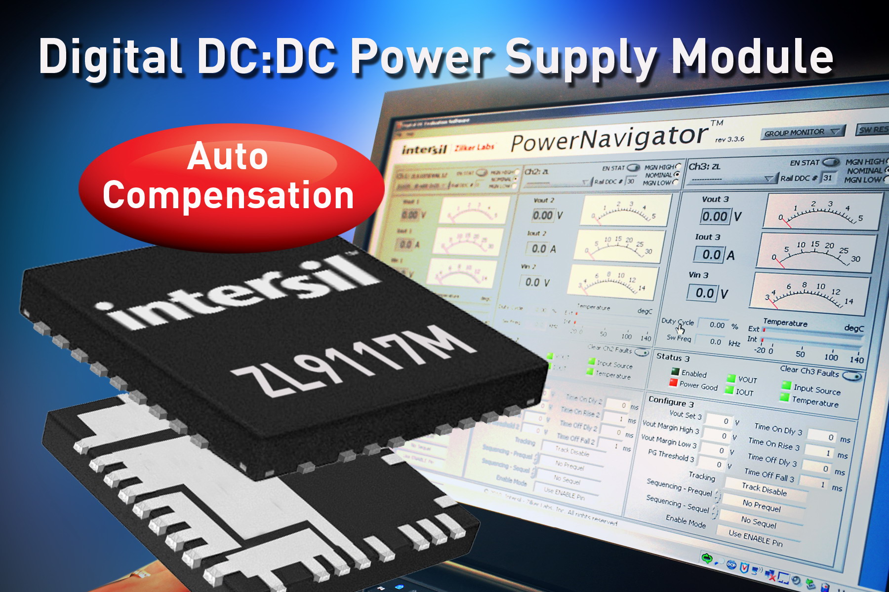 Intersil推出最新17A數(shù)字電源模塊ZL9117MZL9117M通過PMBus支持遠(yuǎn)程監(jiān)控,可并聯(lián)以提供更高電流。