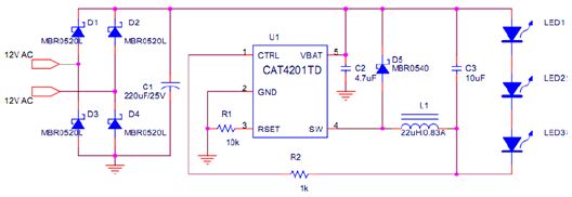 該設計中提供了使用CAT4201設計驅動3顆LED的MR-16燈所需的各種要素。CAT4201有助于實現MR-16兼容適配器更小的尺寸和更少的元件。