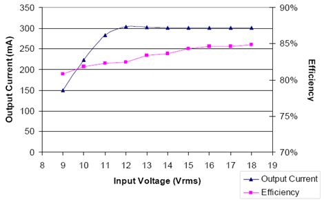 在根據圖1的電路圖配置的電路中,Vin=12 Vac 50Hz。由于AC線路輸入,LED電流出現了很輕微的低頻(AC頻率的兩倍,2 × 50HZ)波動。使用較大容量的C1或較高的Vin將進一步平穩(wěn)與AC相關的紋波電流。