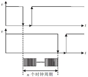 當(dāng)無運(yùn)動物體遮擋光電開關(guān)時(shí),光電開關(guān)的接收端輸出高電平信號,當(dāng)有物體經(jīng)過遮擋時(shí),光電開關(guān)的接收端輸出低電平信號。即當(dāng)高速物體經(jīng)過一對光電開關(guān)時(shí)會先后形成2 個(gè)高電平到低電平的脈沖信號。通過計(jì)時(shí)周期的方式測出這2 個(gè)下降沿之間的計(jì)數(shù)周期個(gè)數(shù)n,計(jì)時(shí)原理如圖1 所示。
