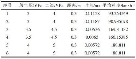 本測速系統(tǒng)已成功應(yīng)用在雙級空氣炮彈射物體測速實(shí)驗(yàn)中,實(shí)驗(yàn)數(shù)據(jù)如表1 所示。