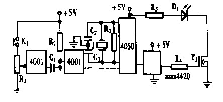為了穩(wěn)定被調(diào)制光信號(hào)的頻率,電路中使用了分頻器CD4060 。它帶有一個(gè)外接晶體振蕩器,內(nèi)部有多級(jí)分頻器。對(duì)于1M 晶振來(lái)說(shuō),經(jīng)過(guò)4 060 的六次分頻,可以得到頻率穩(wěn)定的151625kHz 的方波,再通過(guò)功率場(chǎng)效應(yīng)管的電流放大,就可以同時(shí)驅(qū)動(dòng)上百個(gè)發(fā)光二極管同時(shí)發(fā)光。