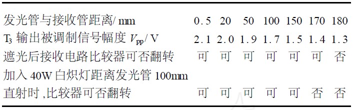 表1 為實(shí)驗(yàn)測(cè)得的數(shù)據(jù)。發(fā)光管和接收管之間正面相對(duì), 兩者之間無(wú)聚焦光學(xué)元件。用有無(wú)遮光對(duì)整機(jī)主要參數(shù)進(jìn)行測(cè)試。由表可知,兩管表面之間的相對(duì)距離在015~170mm范圍內(nèi),無(wú)需調(diào)整靈敏度都能正常工作。