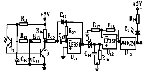 圖2 中的U11 組成二階帶通濾波器, 可以濾去151625kHz 以外的信號(hào)。該級(jí)增益為1 , Q 值為5 ,截止頻率、中心頻率以及濾波特性容易調(diào)整。二極管D1 和電容C14組成檢波電路,可以從151625kHz 信號(hào)上解調(diào)出包絡(luò)信號(hào)。上述兩部分電路可以濾除陽(yáng)光、日光燈、白熾燈等干擾源的作用。