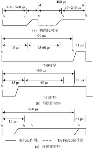 (1)初始化時序。時序見圖2(a),主機總線t0時刻發(fā)送一復位脈沖(最短為480s的低電平信號)接著在t1時刻釋放總線并進入接收狀態(tài),DS18B20在檢測到總線的上升沿之后等待15~60μs,接著DS18B20在t2時刻發(fā)出存在脈沖(低電平持續(xù)60~240s),如圖中虛線所示。