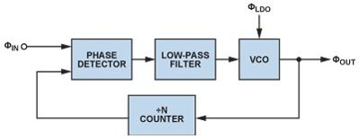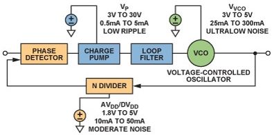 鎖相環(huán)(PLL)是現(xiàn)代通信系統(tǒng)的基本構(gòu)建模塊PLLs通常用在無(wú)線電接收機(jī)或發(fā)射機(jī)中,主要提供"本振"(LO)功能;也可用于時(shí)鐘信號(hào)分配和降噪,而且越來(lái)越多地用作高采樣速率模數(shù)或數(shù)模轉(zhuǎn)換的時(shí)鐘源。由于每一代PLL的噪聲性能都在改善,因此電源噪聲的影響變得越來(lái)越明顯,某些情況下甚至可限制噪聲性能。本文討論圖1所示的基本PLL方案,并考察每個(gè)構(gòu)建模塊的電源管理要求。