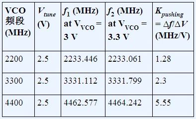 VCO推壓的測(cè)量方法如下:向VTUNE引腳施加直流調(diào)諧電壓,改變電源電壓并測(cè)量頻率變化。推壓系數(shù)是頻率變化與電壓變化之比,如表1所示,使用的是ADF4350 PLL.
