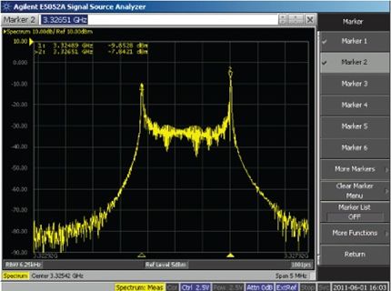 另一種方法:將低頻方波直流耦合至電源內(nèi),同時(shí)觀察VCO頻譜任一側(cè)上的頻移鍵控 (FSK)調(diào)制峰值(圖2)。峰值間頻率偏差除以方波幅度,便得出VCO推壓系數(shù)。該測(cè)量方法比靜態(tài)直流測(cè)試更精確,因?yàn)橄伺c直流輸入電壓變化相關(guān)的任何熱效應(yīng)。圖2顯示ADF4350 VCO輸出在3.3 GHz、對(duì)標(biāo)稱3.3 V電源施加10 kHz、0.6 V p-p方波時(shí)的頻譜分析儀曲線圖。對(duì)于1.62 MHz/0.6 V或2.7 MHz/V的推壓系數(shù),最終偏差為3326.51 MHz – 3324.89 MHz = 1.62 MHz.該結(jié)果可與表1中的靜態(tài)測(cè)量 2.3 MHz/V比較。