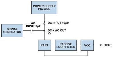 電荷泵的低功耗使其看似頗具吸引力,可使用升壓轉(zhuǎn)換器從較低的電源電壓產(chǎn)生高電荷泵電壓,然而與此類DC-DC轉(zhuǎn)換器相關(guān)的開(kāi)關(guān)頻率紋波可能在VCO的輸出端產(chǎn)生干擾雜散音。高PLL雜散可能造成發(fā)射機(jī)發(fā)射屏蔽測(cè)試失敗,或者降低接收機(jī)系統(tǒng)內(nèi)的靈敏度和帶外阻塞性能。為幫助指導(dǎo)轉(zhuǎn)換器紋波的規(guī)格,使用圖6的測(cè)量設(shè)置針對(duì)各種PLL環(huán)路帶寬獲得全面電源抑制曲線圖與頻率的關(guān)系。