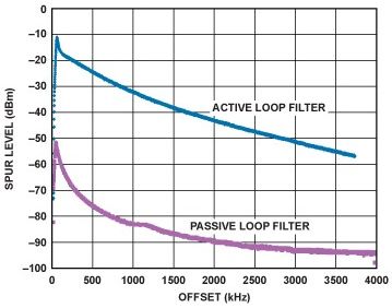 電荷泵將鑒相器誤差電壓轉(zhuǎn)換為電流脈沖,并通過(guò)PLL環(huán)路濾波器進(jìn)行積分和平滑處理。電荷泵通??稍谧疃嗟陀谄潆娫措妷海╒P)0.5 V的電壓下工作。例如,如果最大電荷泵電源為5.5 V,那么電荷泵只能在最高5 V輸出電壓下工作。如果VCO需要更高的調(diào)諧電壓,則通常需要有源濾波器。有關(guān)實(shí)際PLL的有用信息和參考設(shè)計(jì),請(qǐng)參見(jiàn)電路筆記CN-0174,5,處理高壓的方式請(qǐng)參見(jiàn)利用高壓VCO設(shè)計(jì)高性能鎖相環(huán),"6該文章發(fā)表于模擬對(duì)話第43卷第4期(2009)。有源濾波器的替代方案是使用PLL和針對(duì)更高電壓設(shè)計(jì)的電荷泵,例如ADF4150HV ADF4150HV可使用高達(dá)30 V的電荷泵電壓工作,從而在許多情況中省去了有源濾波器。