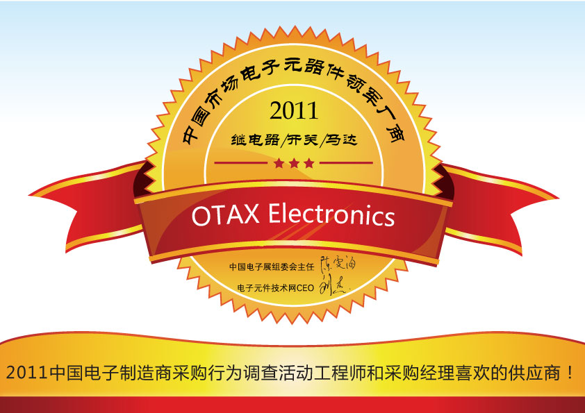 在近日剛剛結(jié)束的2011中國電子制造商采購行為調(diào)查暨中國市場電子元器件領(lǐng)軍廠商的評選活動中,OTAX Electronics憑借持續(xù)穩(wěn)定的產(chǎn)品、技術(shù)和服務(wù)等多方面優(yōu)勢,以及在工程師心目中形成的良好形象,一舉榮獲2011中國市場電子元器件(繼電器/開關(guān)/馬達(dá)類)領(lǐng)軍廠商稱號!